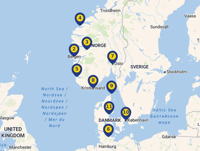Spoznajte miesta, kde Vaša loď počas plavby zakotví! Každá zastávka je označená číslom, ktoré zodpovedá jej pozícii na mape, aby ste mohli jednoducho sledovať celú trasu. Stačí kliknúť na vybranú destináciu a zistíte viac o každej z nich. Pre ešte lepší prehľad si môžete celý program plavby prezrieť priamo na mape.