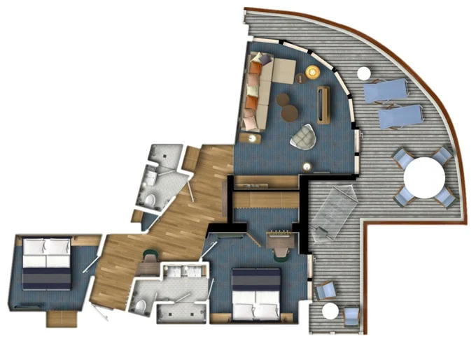 SPNO - Panorama Suite 73-77 m² + balkón 31-36 m² so stolom, ležadlami a hojdacou sieťou. 2 spálne a 2 kúpeľne. 6,9,10. paluba. Max 6 osoby. Výhody Suite. 11 045 € 2 209 € za osobu
