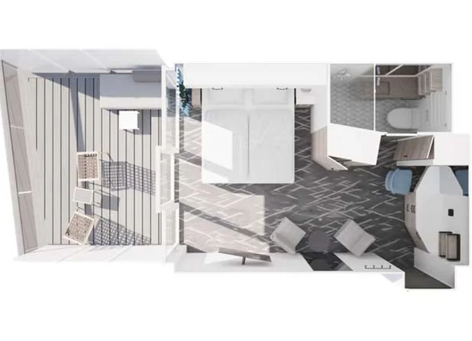 VEKO - Kajuta s terasou 20 m² + balkón 13 m² so stoličkami a váľandou. 15. paluba. Max 2 osoby. 3 382 € 3 382 € za osobu